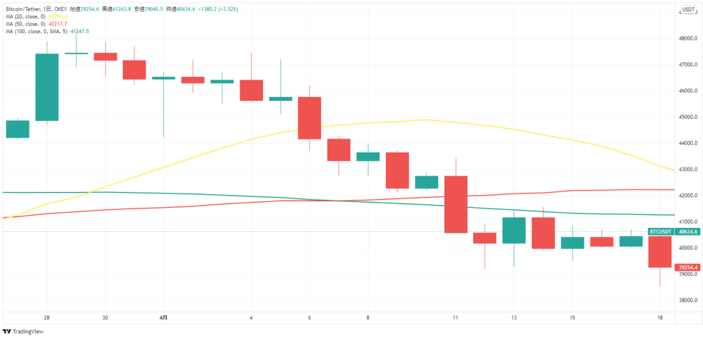BTCは週末のほとんどが39,500USDT~40,700USDT間のレンジであったが、週明けは39,000USDTを下回った。