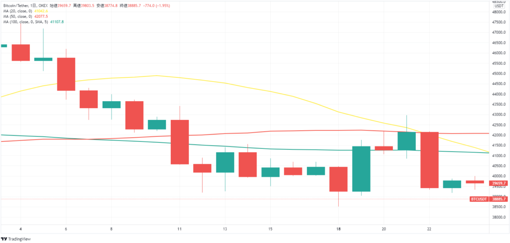 BTCは40,000USDTを下回り、先週最初の水準に戻っている。