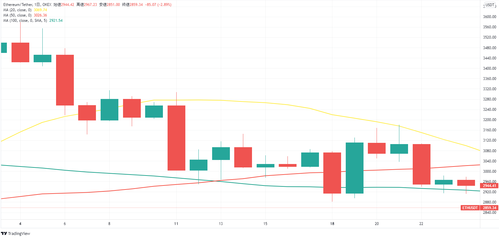 ETHは、BTC同様に下落。先週の月曜日以降で初めて3,000USTDを割り込んだ。