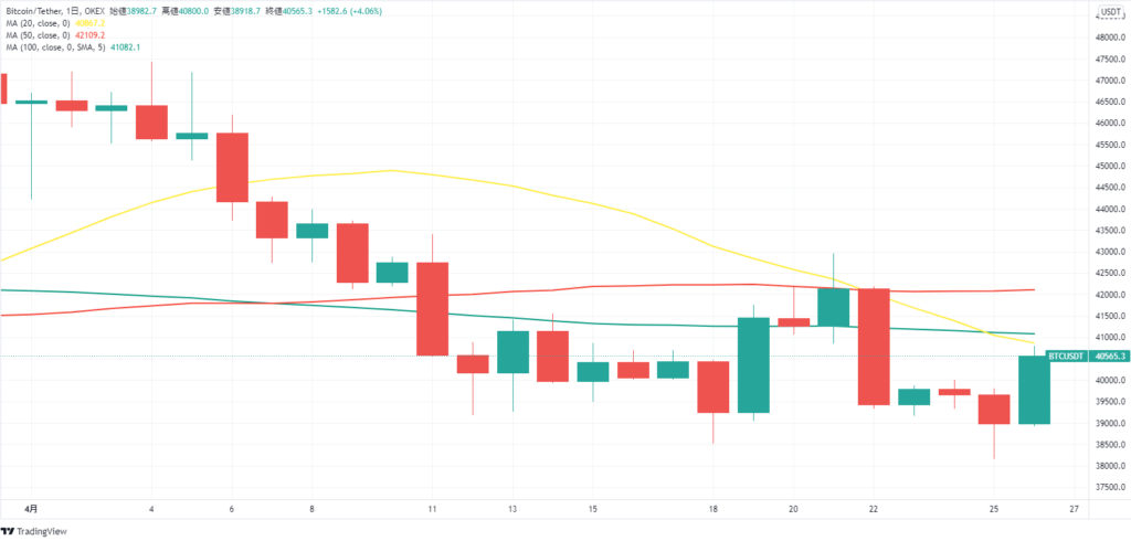 日足では下ヒゲを付けているが、再び40,000 USDTを割り込むかどうかは1つのポイントとなりそうだ。