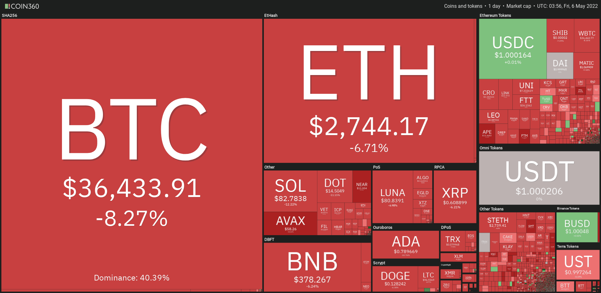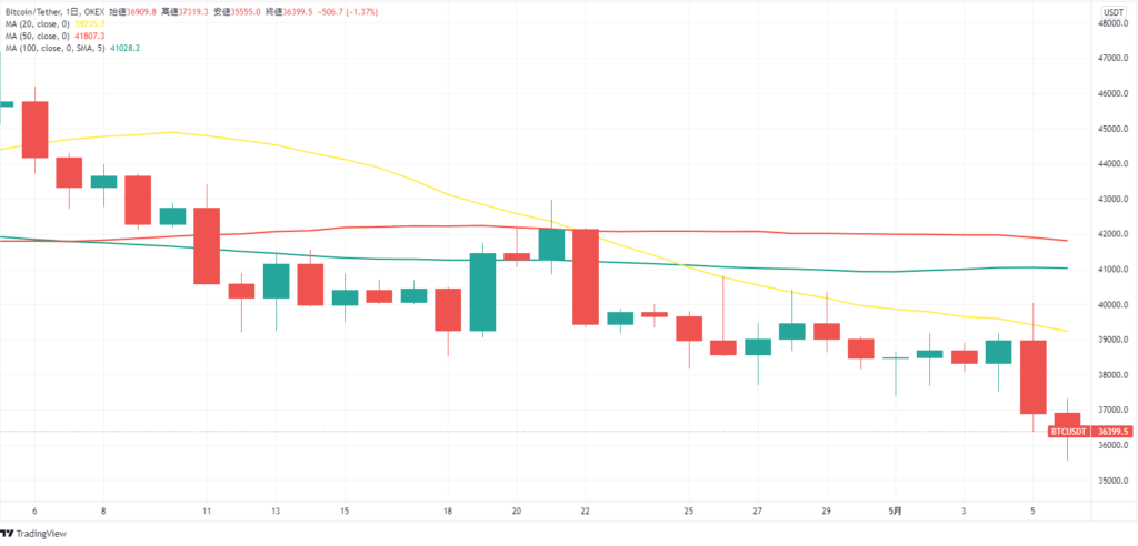 BTCは36,555USDTまで下落し、サポートラインとなっていた36,750USDTを明確に割り込んだ。