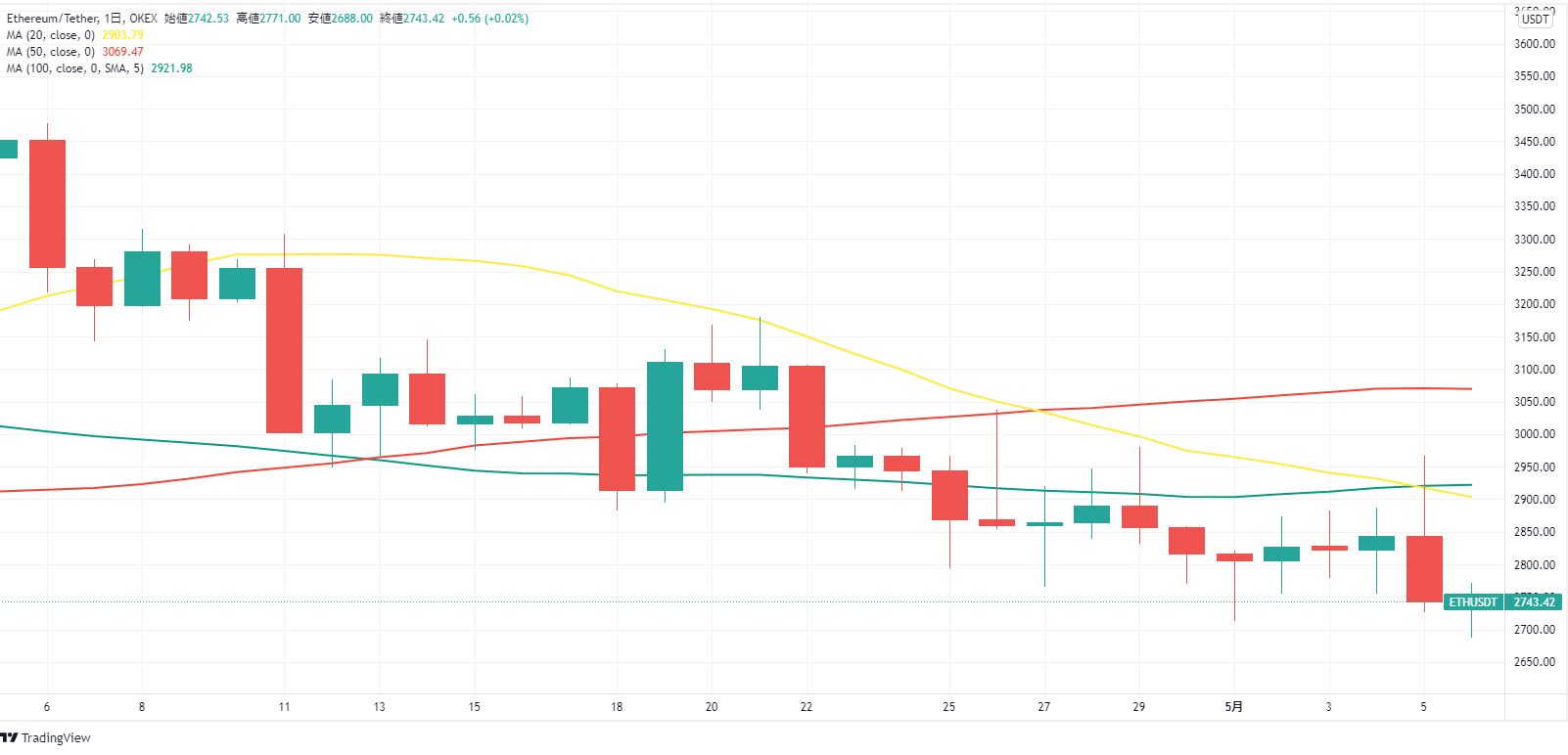 BTCと同様に、ETHもいよいよサポートラインとされていた2,750USDTを明確に割り込んだ。
