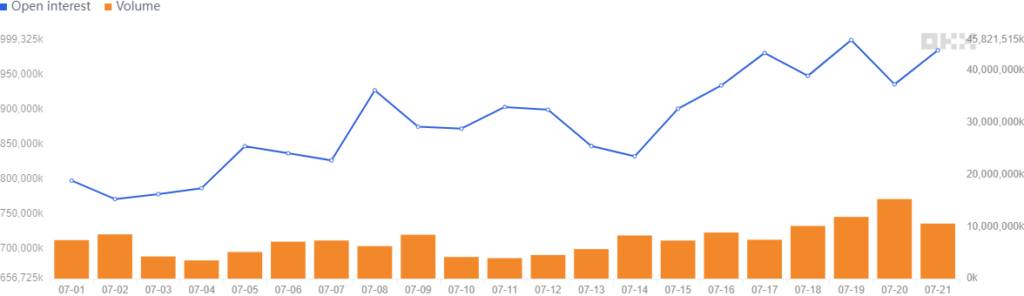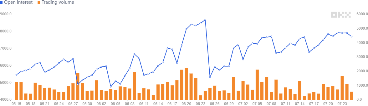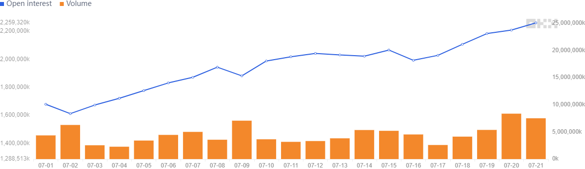 7月のオプション未決済建玉は増加傾向にあり、先物市場と同様に、新規の資金がBTCオプション市場に流入したことを示している。この傾向は一般的に強気相場であることを示すサインとなる。