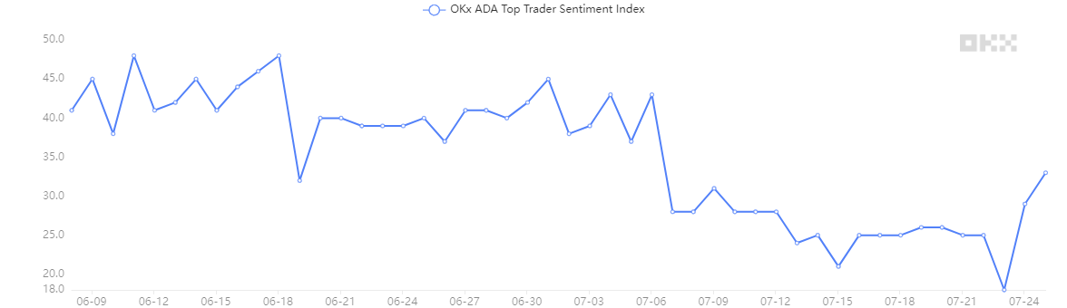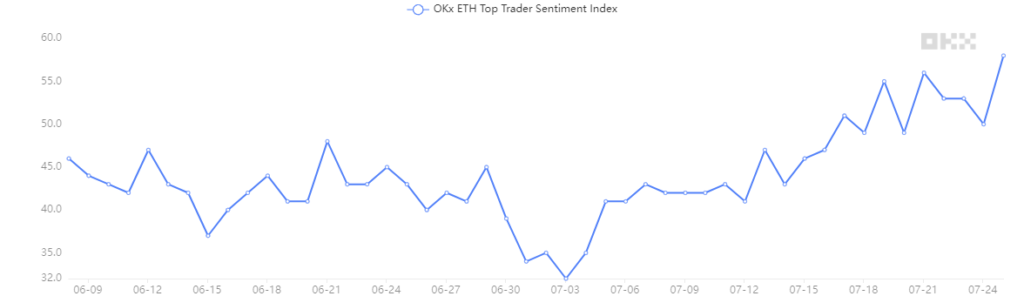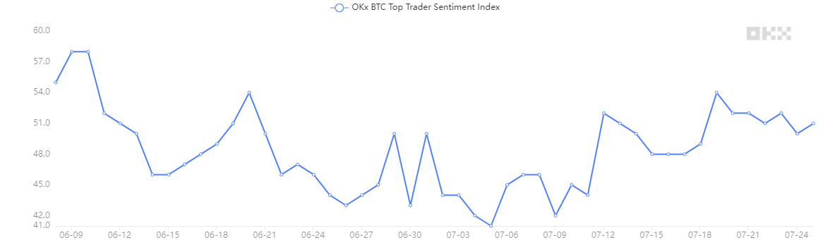 上記のトップトレーダーセンチメント指数は、海外暗号資産取引所OKXの出来高上位100名のトレーダーそれぞれを1票として、ロングとショートの比により算出された指標だ。