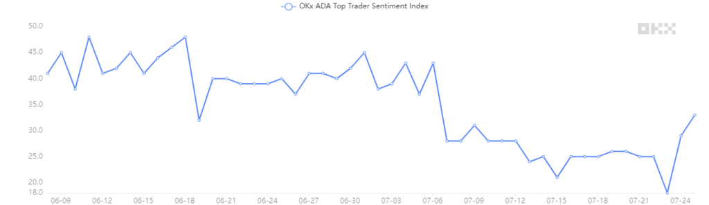 ETHのセンチメントも 7月の頭に底打ちしたように見える。一方、アルトコインのポルカドット(DOT)やエイダ(ADA)のセンチメントは7月以降上昇に転じていない。