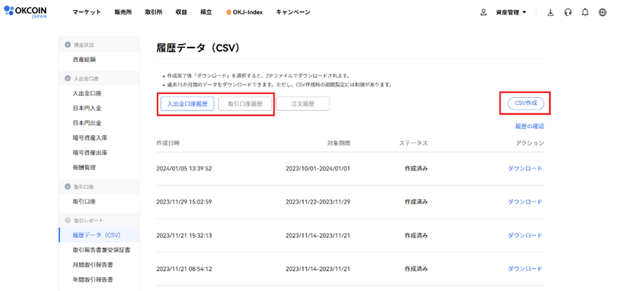 表示された画面の「入出金口座履歴」と「取引口座履歴」をそれぞれ選択して右側の「CSV作成」をクリックして、取得したい期間を選択するとデータが作成され、データのダウンロードができます。