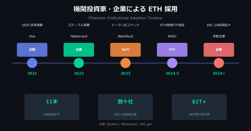 個人投資家の間で広まったイーサリアムは、今やグローバルな金融機関や大企業にも採用される段階に入っている。先駆的な動きとして、2021年にVisa社がステーブルコインUSDCを用いた決済実験を開始し、翌2022年にはMastercardも同様の取り組みを進めた。伝統的な決済ネットワークがブロックチェーン上のステーブルコインを実際の決済に組み込み始めたことは、イーサリアムのインフラとしての信頼性が世界的に認められた証左といえる(出典:Reuters)。