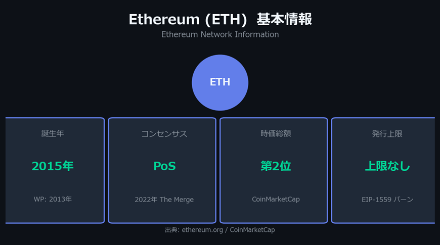 イーサリアム(Ethereum)とは、スマートコントラクトを実行できる世界最大級のプログラム可能なブロックチェーンプラットフォームであり、その通貨単位をETHと呼ぶ。2015年にVitalik Buterinが設計・ローンチして以来、DeFi・NFT・Layer2などWeb3エコシステムの中心的インフラとして機能し続け、2025年時点でビットコインに次ぐ時価総額世界第2位の暗号資産となっている(出典:CoinMarketCap)。