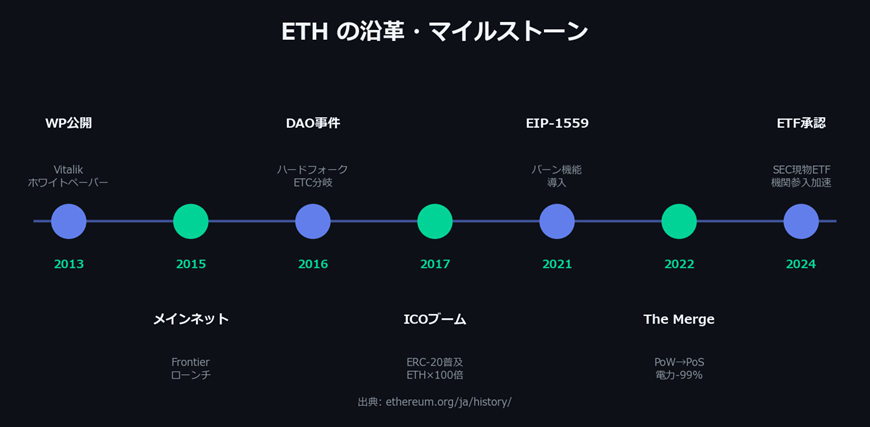 直近では2024年3月のDencunアップグレード(EIP-4844)でBlob取引が導入されてLayer2コストが大幅に削減された。さらに同年5月、米国証券取引委員会(SEC)がETH現物ETFを承認したことで状況は一変した。BlackRock・Fidelityなど大手金融機関が計11本のETH現物ETFを提供し始め、機関投資家がイーサリアムへ本格参入する扉が開かれている(出典:SEC.gov)。