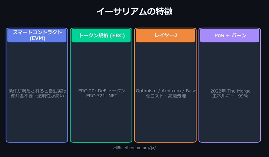 イーサリアムが他のブロックチェーンと一線を画す理由は、独自の技術的特徴の組み合わせにある。これら5つの特徴が相互に作用することで、DeFi・NFT・DAOといった多彩なサービスが成立しているのだ。