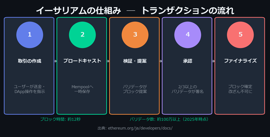 イーサリアム上の取引(トランザクション)は、送信から最終確定まで大きく5つのステップをたどる。まずユーザーがETHの送金やDApp操作を行うと、秘密鍵で署名された取引データがネットワーク全体にブロードキャストされ、Mempoolと呼ばれる一時的な待機エリアに格納される。次にPoSのバリデータがランダムに選ばれ、Mempoolの中から取引を束ねて新しいブロックを提案する。この提案ブロックを他のバリデータが検証し、全体の2/3以上の署名(Attestation)を集めたブロックだけがチェーンに正式に追加される仕組みだ。最後に一定の条件が揃うとブロックがファイナライズ(確定)され、その内容は以降いかなる手段でも改ざんできない永続データとなる。
