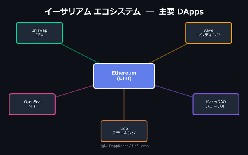 イーサリアム上には世界中の開発者が構築した数千を超えるDApps(分散型アプリケーション)が存在し、活発なエコシステムを形成している。なかでもDeFi・NFT・リキッドステーキングの各領域において特に影響力の大きい5つのプロジェクトを以下に紹介する。