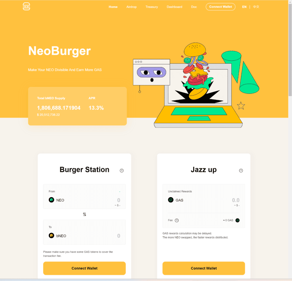 NeoBurgerは、Neo上で存在する流動性ステーキング(Liquid Staking)プラットフォームです。NeoBurgerはNEO保有者に代わり、預けられたNEOを利用してNEOガバナンスに参加します。NEO保有者は、GAS報酬をbNEOの形式で分配されます。