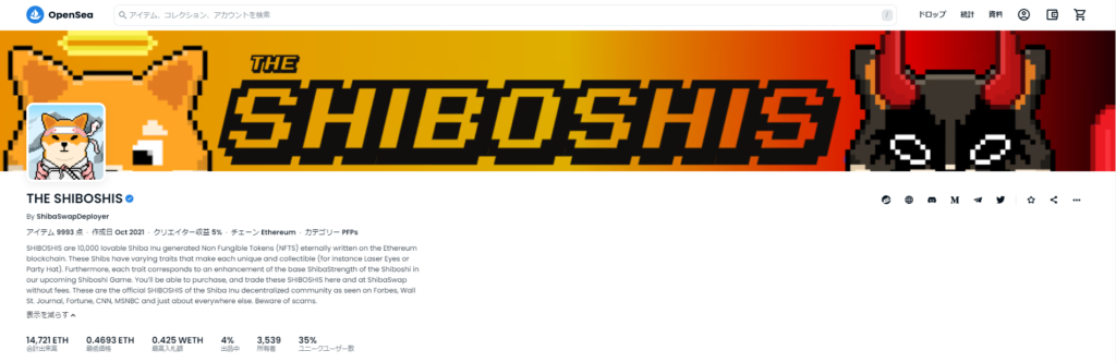 「THE SHIBOSHIS」は10,000体のシバイヌのNFTコレクションです。 NFTマーケットプレイス OpenSeaでも購入することができます。トータルの出来高は14,721ETHと現在のレート(1ETH=約210,000円)で換算すると約30億円に上り、数あるNFTコレクションのトータルランキングでも100番台となっています。