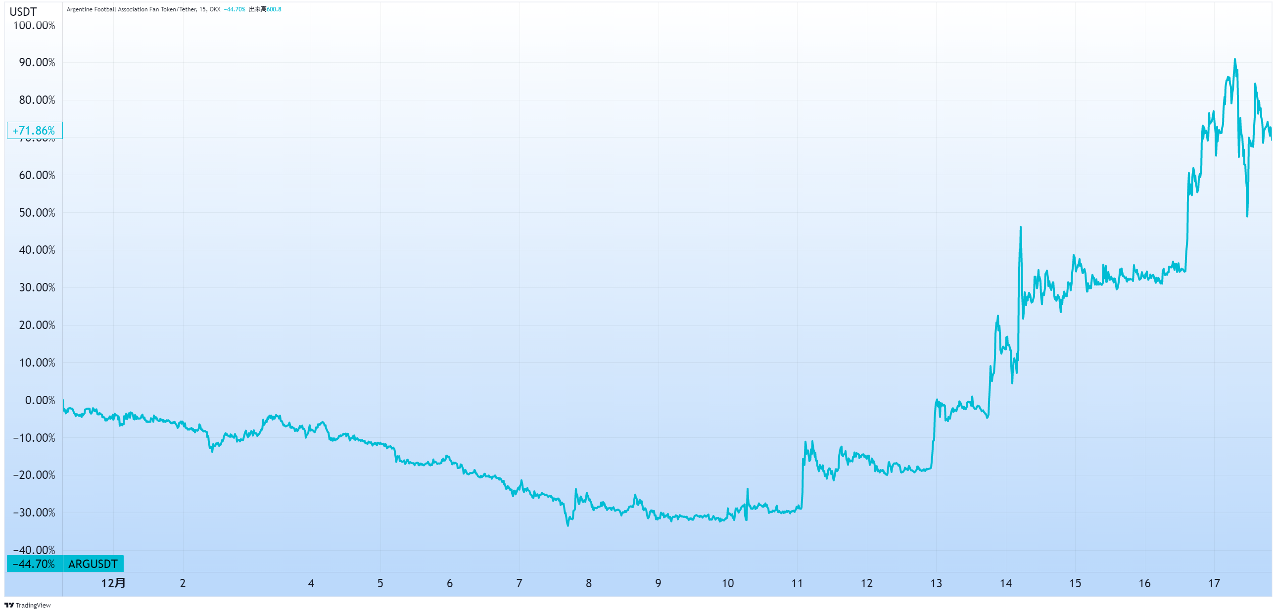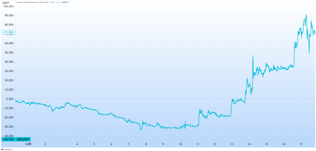 優勝したアルゼンチンのファントークンARGは、12月1日の約500円から決勝戦の直前には約2倍になりました。