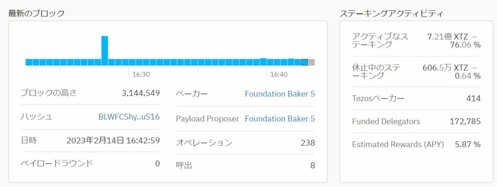 2023年2月14日時点で、XTZの循環供給量のうち約76%がアクティブなステーキング数量となっています。
