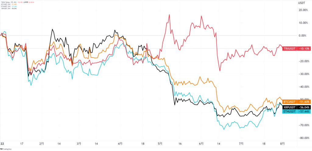 上記は、暗号資産TRX、BTC、XRP、ETHの2022年の騰落率を表しています。