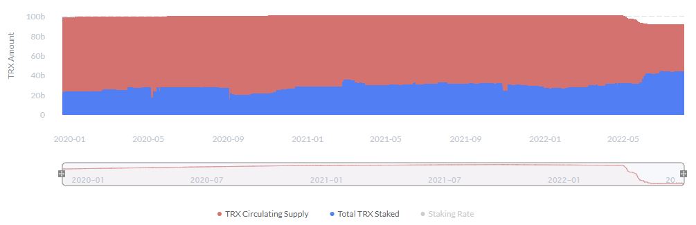 2022年8月3日時点で、TRXの循環供給量のうち43.94%がステーキングされています。循環供給量に占めるステーキングされたTRXの割合は、2020年1月から約2倍に上昇しており、これはTRXが暗号資産の流通量を減らす仕組みであるバーン(焼却)を採用していることとも関係しています。