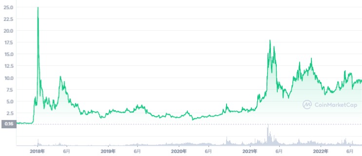 TRXの史上最高値は20円を超えており、ビットコイン(BTC)が2017年当時で史上最高値を付けた2017年12月8日から約1ヶ月後でした。
