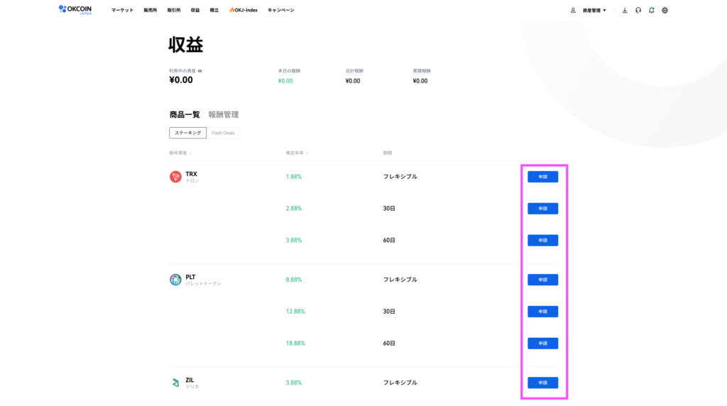 2.ステーキングしたい銘柄を選んで「申請」をクリック