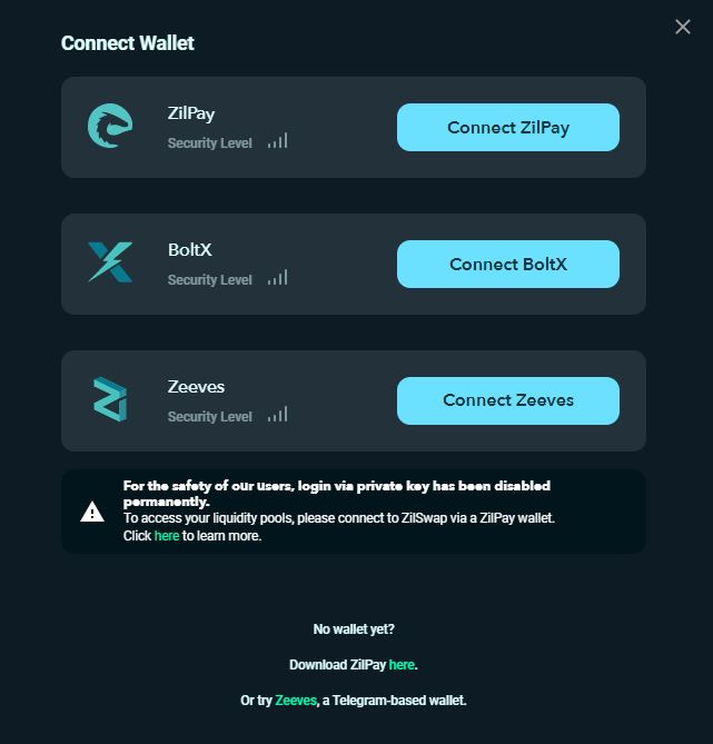 最後に、ZilSwapでスワップや流動性マイニングを行うには、ZilSwapにウォレットを接続する必要があります。 現在はZilPay、BoltX、Zeevesのウォレットに対応しています。