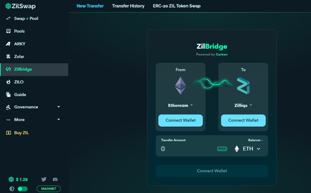 ZilSwap上では、ZilBridgeを利用することでウォレットに保有しているETHとZILを簡単にスワップできます。ETH以外にもERC-20規格のトークンUSDTやWrapped Bitcoin (WBTC)にも対応しているため、メジャーな通貨からZILに交換しやすい環境が整っています。